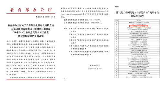 本网讯( 通讯员 李盼)近日,教育部办公厅发布《第三批新时代高校党建示范创建和质量创优工作和第二批高校“双带头人”教师党支部书记工作室建设单位验收结果的通知》,极速快三