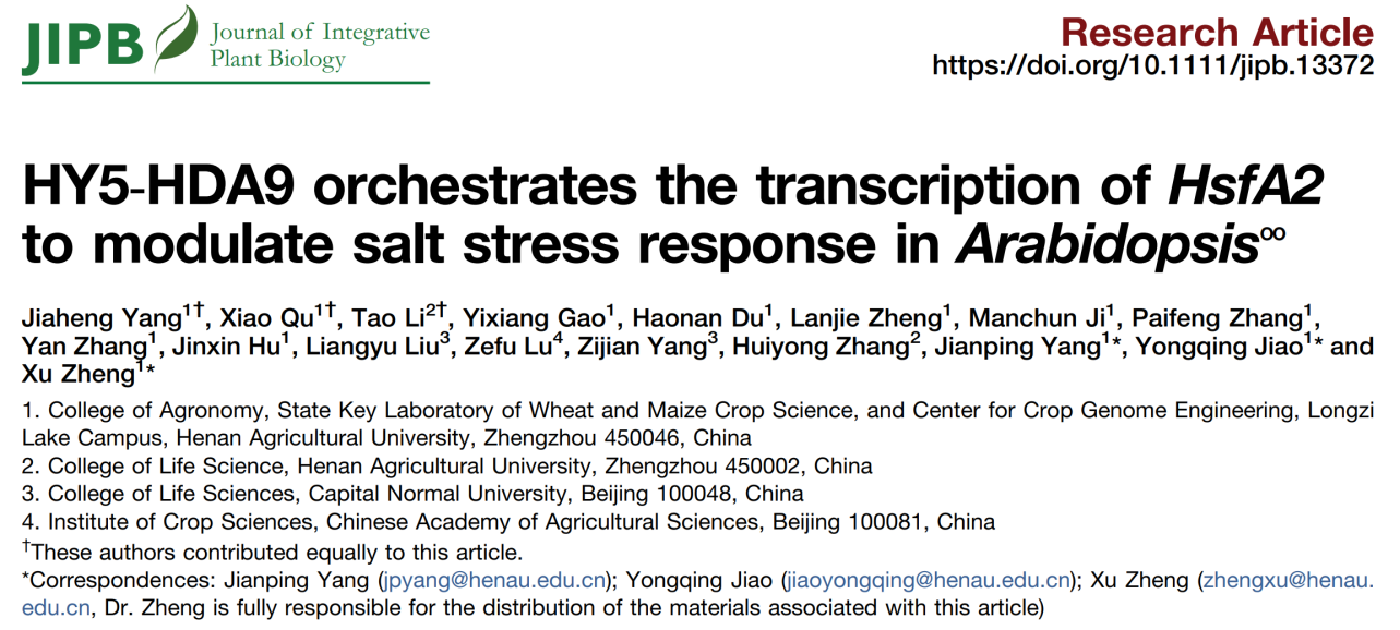 作物基因组与分子育种中心郑旭教授团队、矫永庆教授团队和杨建平研究员团队联合解析了光信号在调控植物盐胁迫反应的分子机制。该研究成果以题为“HY5-HDA9 orchestrates the transcription of HsfA2 to modulate salt stress response in Arabidopsis”在线发表在植物学知名学术期刊Journal of Integrative Plant Biology(2022, doi:10.1111/jipb.13372.2023, IF:9.106)上。郑旭教授、矫永庆教授和杨建平研究员为共同通讯作者;博士研究生杨家蘅、硕士生曲晓和生命科极速快三