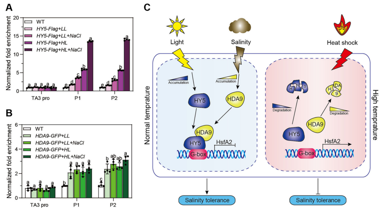 (A,B)不同光照或盐浓度条件下HY5和HDA9与HsfA2启动子结合的ChIP‐qPCR分析。(C)HY5‐HDA9响应光照和温度变化动态调节植物的耐盐性模型。