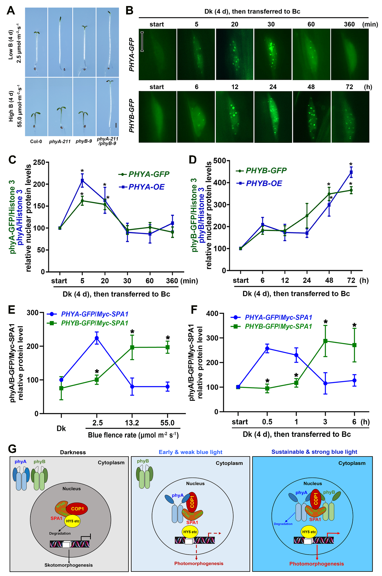 图1. (A)蓝光下,phyB-9突变体在phyA-211突变体背景下表现出更强的黄化反应;(B)phyA-GFP与phyB-GFP在黑暗到蓝光转换中的核小体荧光观察;(C)内源phyA与phyA-GFP蛋白、(D)内源phyB与phyB-GFP蛋白在黑暗到蓝光转换中的蛋白核聚集观察;(E)在弱蓝光和蓝光照射早期phyA-GFP与SPA1的结合能力较强;(F)而在中度和强度蓝光和持续蓝光照射中phyB-GFP与SPA1的结合能力较强;(G)phyA与phyB蓝光下互作模型:蓝光激活的phyA与phyB以互补的方式与SPA1蛋白互作,从而解除SPA1对HY5的抑制,激活光形态建成基因的表达,从而促进植物光形态建成的发育。