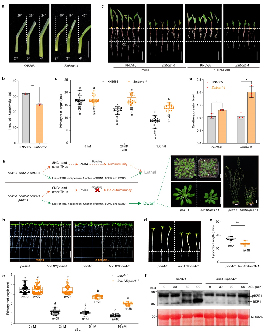 Copine基因是一个在人、哺乳动物及绿色植物等真核生物中高度保守的基因家族,多项遗传学研究证明其在不同物种中发挥重要功能。BONZAI基因多年来被认为是植物防御系统的负调控因子,其突变体的矮小表型可能是由于抗病防御反应被激活造成的。而Copine蛋白在植物演化过程中是否具有更保守的功能仍不清楚。该研究通过CRISPR/Cas9基因编辑技术创制了玉米BONZAI同源基因ZmBON1和ZmBON3的敲除突变体。经鉴定发现玉米Zmbon1、Zmbon1/3突变体出现明显的生长矮小表型,但突变体并未表现出任何防御反应被激活的表型与生理生化特征。此外,Zmbon1的矮小表型伴随着多种BR缺陷突变体的形态特征,因此推测Zmbon1的矮小表型可能和BR相关。BR诱发的根抑制实验发现,Zmbon1对BR的敏感性下降 (图1),证明ZmBON1的确参与了BR信号通路。为验证BONZAI基因参与BR信号通路的生物学功能是否具有保守性,该研究对拟南芥BONZAI家族成员突变体进行了BR敏感性测验。结果发现,相比于pad4-1单突变体,bon1-1 bon2-2 bon3-3 pad4-1四突变体表现出明显的BR不敏感表型 (图1)。这些结果表明BONZAI基因家族成员存在功能冗余,其参与BR信号通路的生物学功能在双子叶植物拟南芥中具有保守性。