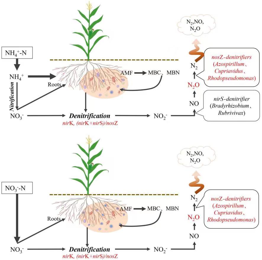 2O emissions by altering root traits and soil denitrifier community composition”的研究论文,在丛枝菌根真菌调控不同氮肥类型条件下土壤氮循环和氧化亚氮(N