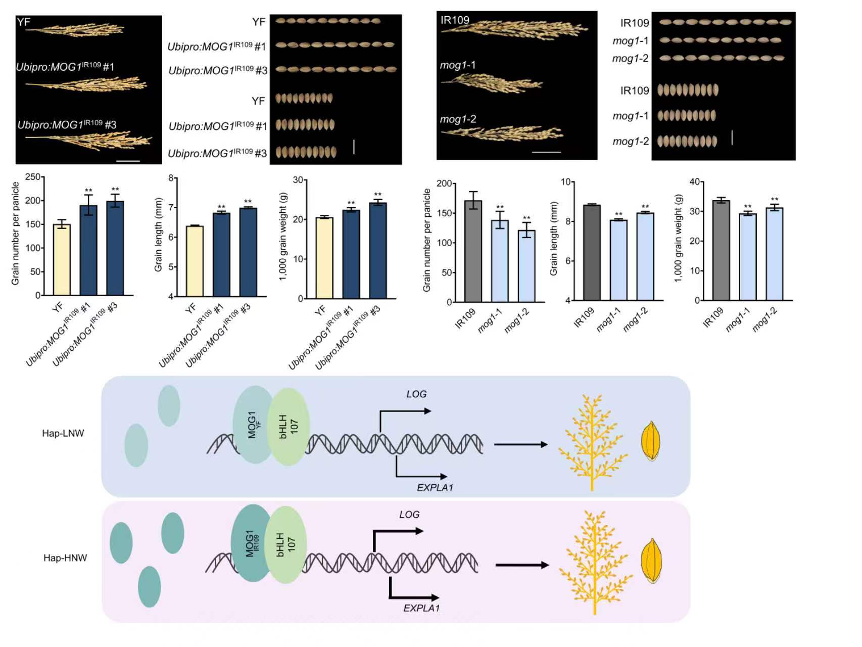 穗粒数和粒重是产量的两个主要组成部分。然而,穗粒数和粒重之间存在相互制衡关系,同时增加粒重和粒数的基因极少。李俊周团队与中国农业大学张战营副教授合作从稻种资源中挖掘到一个水稻穗粒数和粒重调控基因MOG1,并揭示了其提高产量的分子机制。研究是利用导入系构建遗传分离群体,图位克隆控制穗粒数和粒重基因MOG1,该基因可同时增加穗粒数和粒重。高表达MOG1增加穗粒数、粒长和粒重,提高产量;而敲除该基因则降低了穗粒数、粒长和粒重,产量降低。MOG1启动子的自然变异影响其转录水平,MOG1与粒长基因bHLH107相互作用,共同激活细胞分裂素激活酶基因LOG和细胞扩展蛋白基因EXPLA1的表达,从而增加幼穗细胞分裂素含量,促进细胞分裂和细胞伸长,增加穗粒数和粒重。单倍型分析表明,MOG1Hap-LNW起源于野生稻,经过选择和变异产生粳稻MOG1优势等位基因MOG1Hap-HNW,优势等位基因增加穗粒数和粒重,但MOG1Hap-HNW优势等位基因在温带粳型水稻粒型改良中未得充分利用,MOG1可能是进一步提升产量的重要基因。研究成果以“Natural variation in MORE GRAINS 1 regulates grain number and grain weight in rice”为题发表在国际知名期刊Journal of Integrative Plant Biology上。极速快三