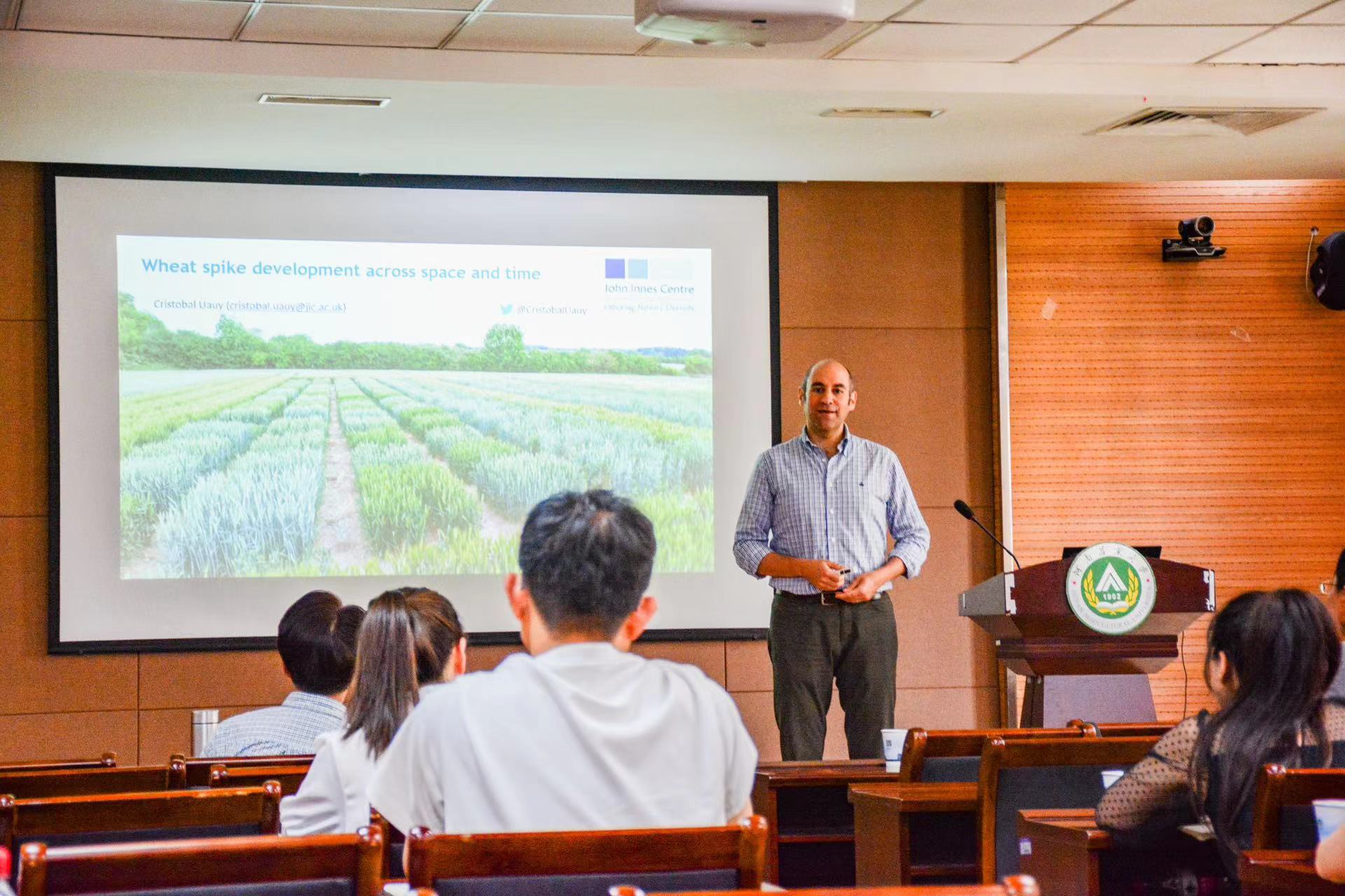 Cristobal Uauy教授以小麦叶尖形状为引,用丰富的图片解释了小麦叶尖生长变化,并详细地介绍了SVP和SEP基因对花器官发育的影响。Cristobal Uauy教授一幅幅完美结合了艺术与科学的精美幻灯片及循循善诱、平易近人的讲授方式给倾听报告的师生留下了深刻的印象。王晓明副教授通过利用生物信息工具解析小麦根系发育相关基因挖掘与基因互作方向的最新研究科研进展,为开展相关领域研究的工作拓展了思路。报告后的问答环节中,Cristobal Uauy教授、王晓明副教授、肖军研究员与参与报告的师生就报告相关研究进行了具体的交流及讨论。