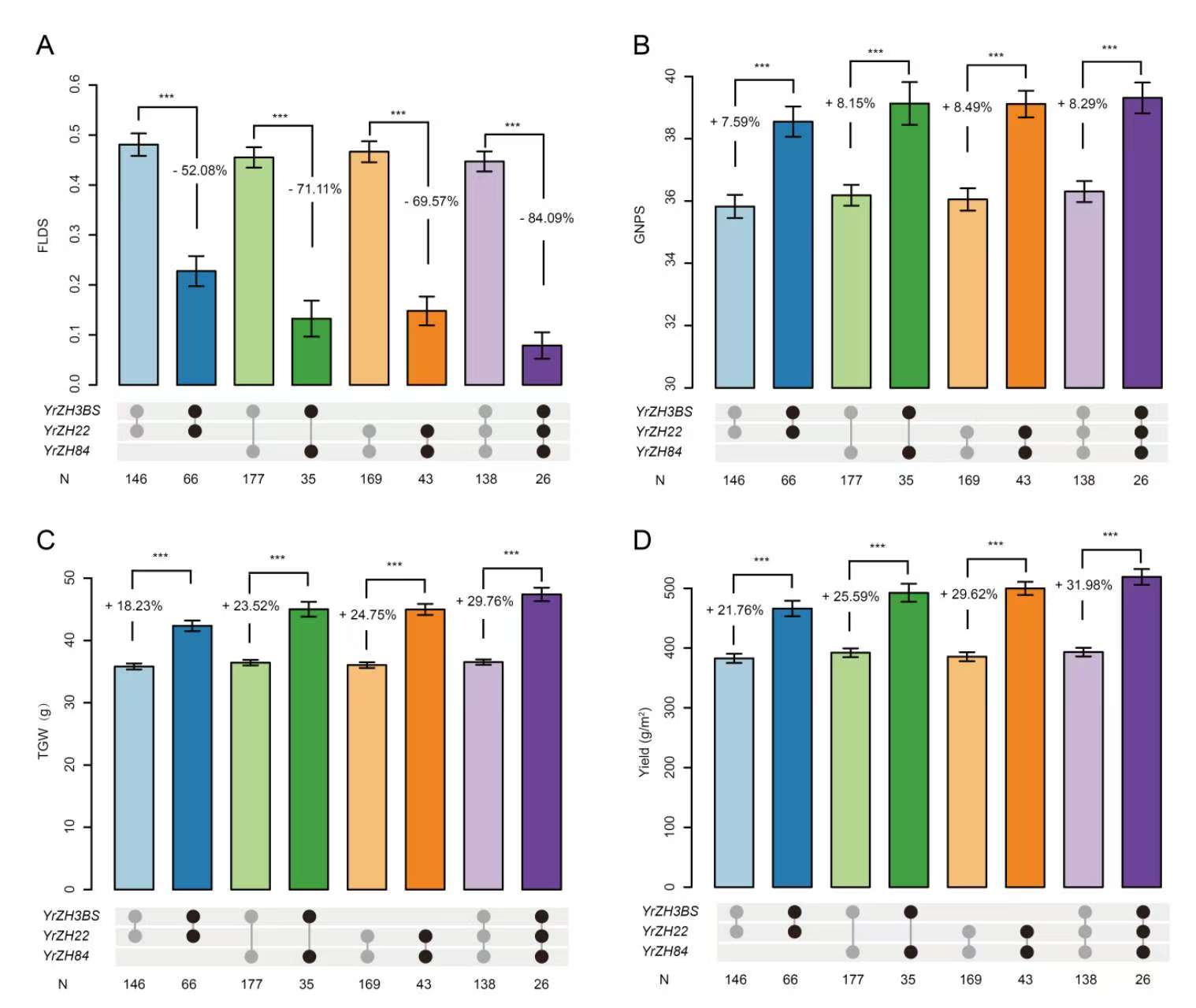 图2. 三个成株期抗性位点对小麦条锈病和产量的综合影响分析。