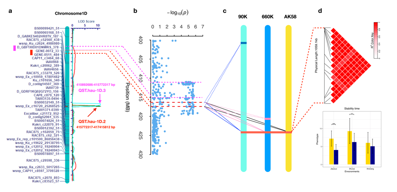 a: QTL定位;b: GWAS; c: QTL定位与GWAS结果在矮抗58基因组上的重叠区域;d: 1D染色体上与稳定时间相关的重叠区域单倍型分析。虚线和实线分别表示更新前后的物理位置