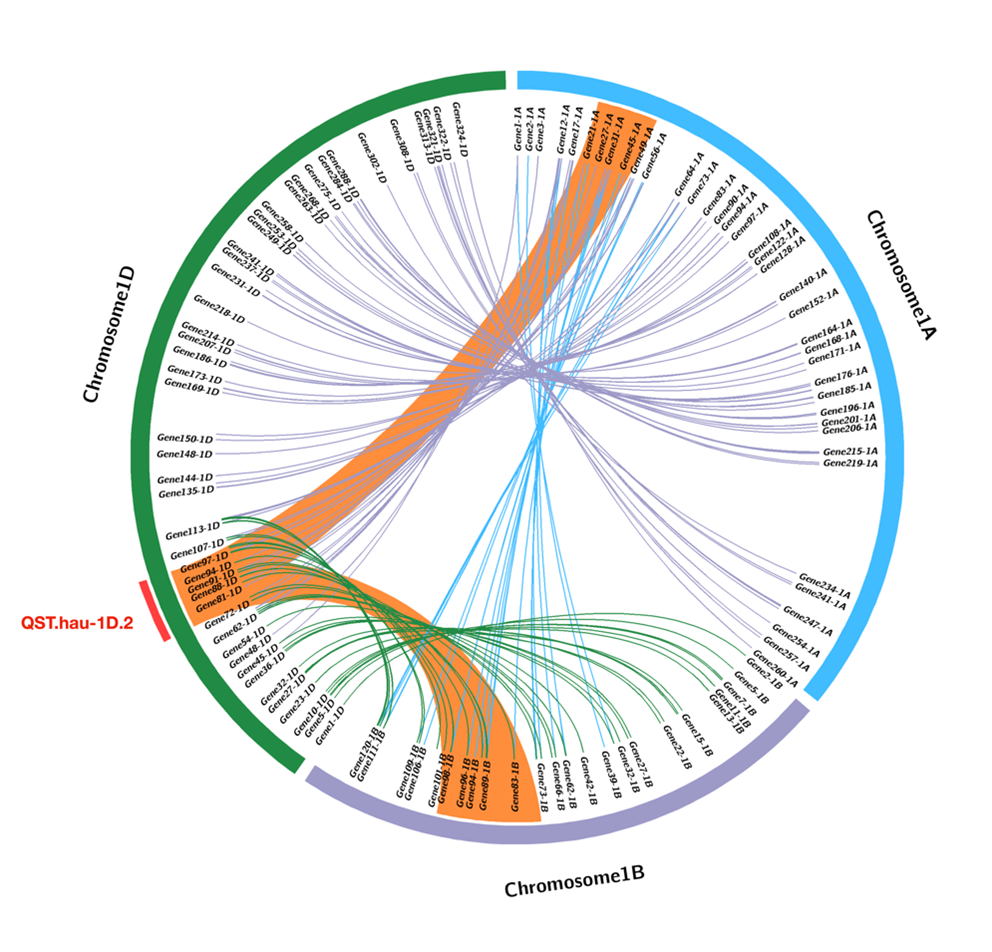 共线性分析表明,35个注释基因位于两个QTL区段内,进一步通过基因功能注释、基因表达量分析、t检验等手段,预测到7个调控小麦面团稳定时间的潜在候选基因,并分析了优异单倍型,从而为小麦品质育种提供了重要基因资源。