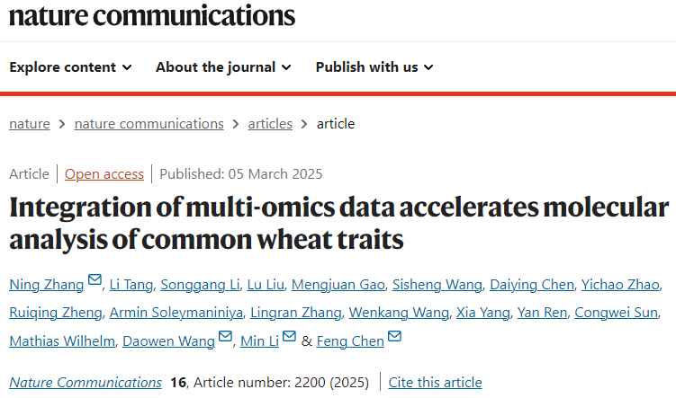 陈锋团队、王道文团队联合中南大学李敏团队在小麦高通量多组学数据数据库搭建和茎基腐病抗性机制研究方面取得突破性进展,于2025年3月5日在国际著名期刊《Nature Communications》 (IF=14.7) 在线发表了题为“Integration of multi-omics data accelerates molecular analysis of common wheat traits”的长篇研究论文。首次系统构建了小麦全生育期的20个组织的转录组、蛋白组、磷酸化组及乙酰化组学的高通量全景图,并揭示了TaHDA9-TaP5CS1模块通过脯氨酸调控小麦茎基腐病的新机制。