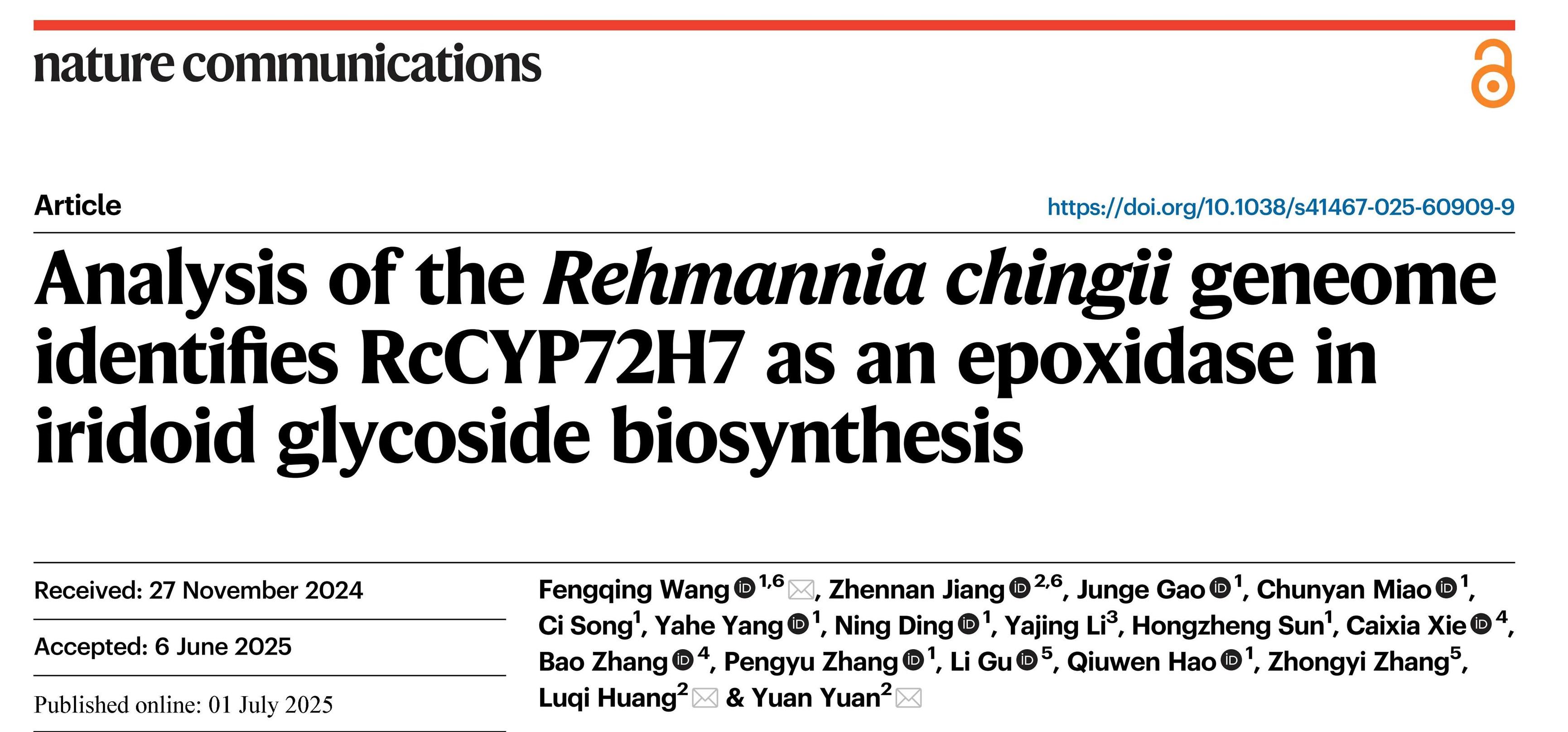 袁媛研究员/黄璐琦院士在《Nature Communications》在线发表了“Telomere-to-telomere genome assembly of Rehmannia chingii identifies RcCYP72H7 as an epoxidase in iridoid glycoside biosynthesis”的研究论文。该研究从头组装并注释了我国特有地黄属植物天目地黄的端粒到端粒无间隙参考基因组,首次发掘出可以催化桃叶珊瑚苷C-7和C-8位环氧化合成梓醇的环氧酶RcCYP72H7,同时从基因组水平揭示了地黄属植物的系统进化地位。