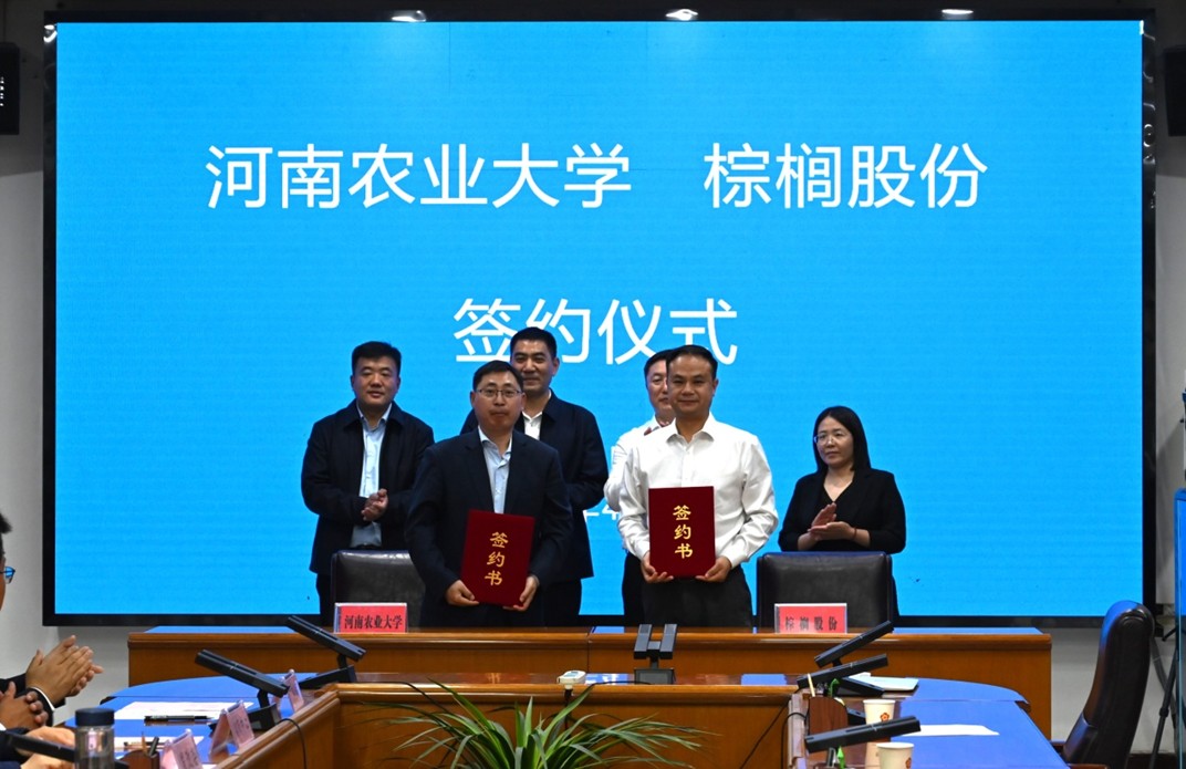 水稻科技团队杜彦修副教授与棕榈股份总裁余海军代表双方签署《沿黄优质粳稻品种选育与推广》项目合作协议。