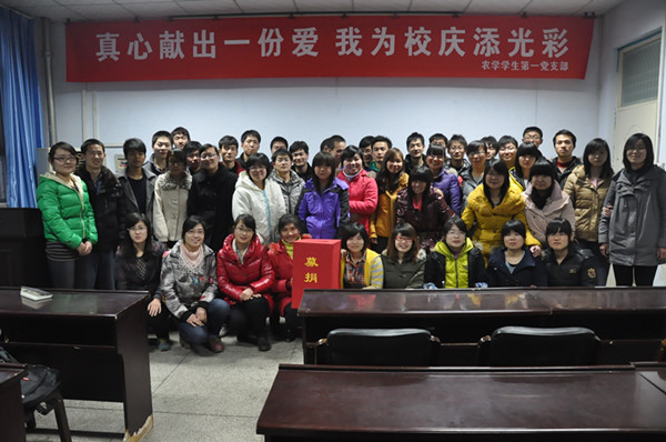 农学学生第一党支部的全体成员在院405教室举行捐款仪式,为百年校庆献礼,表达爱校之心。支部19名党员、36名入党积极分子共捐款1002元。捐款结束后,同学们纷纷在“真心献出一份爱,我为校庆添光彩”的条幅上写下对校庆的期待和农大明天的美好祝福。