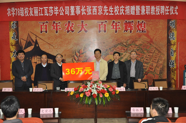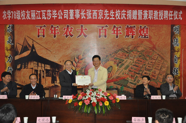 2012年4月12日下午,农学78级校友丽江瓦莎毕公司董事长张西京先生校庆捐赠暨兼职教授聘任仪式在三百人报告厅隆重举行。副校长、校庆筹委会副主任谭金芳出席,校庆办公室常务副主任李世国、计划财务处处长张兆瑞、极速快三