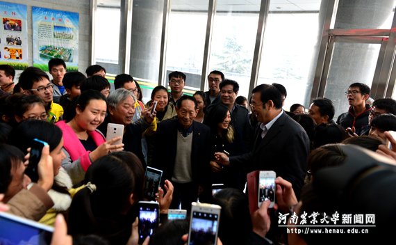 领导及师生进行了座谈,袁隆平院士十分关心农业青年科技人员和大学生,对他们的成长成才寄予厚望。他语重心长地说:“计算机里种不出水稻,也种不出小麦。搞农业研究很辛苦,青年科技人员和大学生要不怕吃苦,走进地里去,走进实践中去,获得真知、学到本领。(文/郭治鹏 图/周红飞)