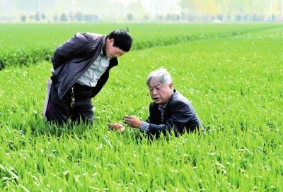 4月15日上午,河南省开封市兰考县城关镇北郊农民邱海军在麦田里拉着小麦专家郭天财教授的手看麦情,问题一个接一个。