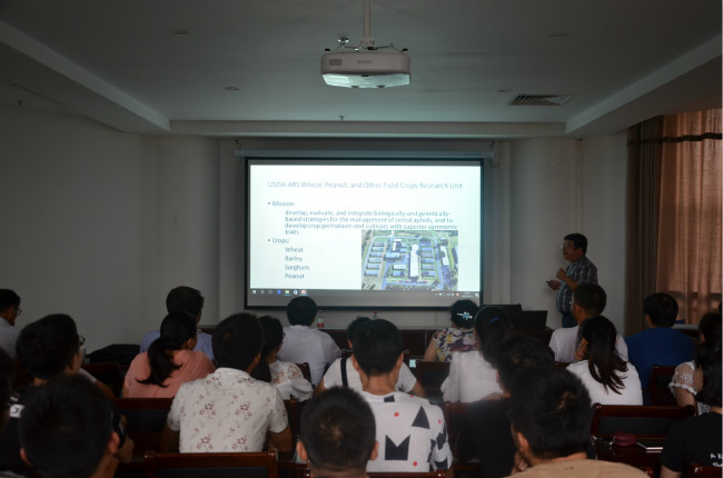 报告会上,徐向阳研究员首先就美国小麦锈病现状和本实验室的研究情况,进行了详细的讲解,接着又讲解了三种主要引起小麦锈病的蚜虫,以及小麦对蚜虫和锈病的抗性基因和抗病机制。