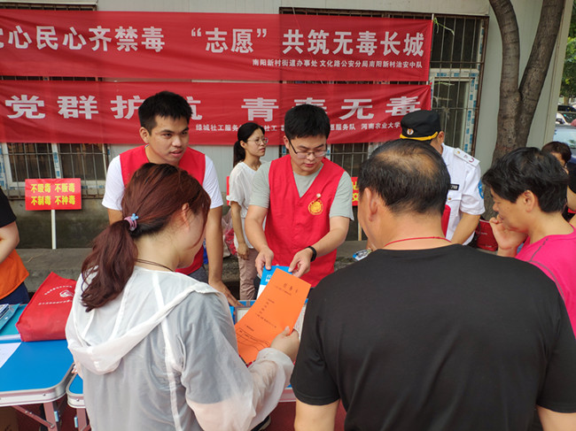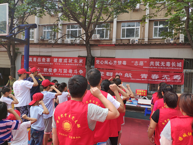研究生党员社会实践服务团联合绿城社工服务站、南阳新村街道办事处、文化路公安分局南阳新村治安中队、群英社区党群志愿服务队等多家单位举办“党群护航,青春无毒”为主题的识毒、禁毒宣传活动,加深广大青少年对毒品的了解,增强全民禁毒意识。