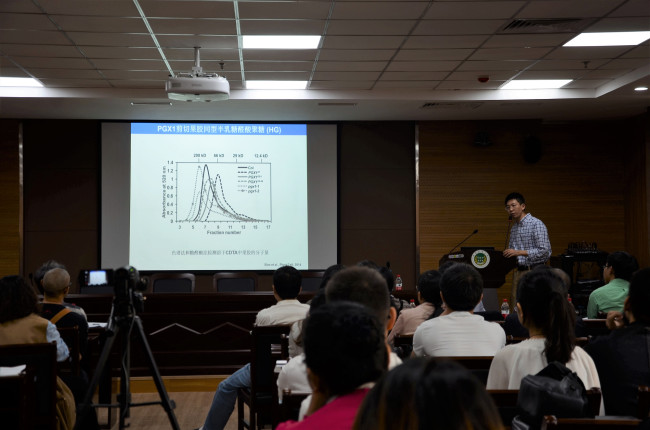 肖朝文研究员以“细胞壁的合成与修饰对植物生长发育的调控”为题,为大家分享了植物细胞壁在植物生长发育中的重要作用,以及植物细胞壁的研究对生物能源的开发和农业生产的重要作用和价值。深入浅出的讲解了细胞壁作为未来能源的前景,果胶的功能和用途,以及PGX1通过剪切果胶同型半乳糖醛酸聚糖改变果胶的可提取性,除此之外,还详细讲述了PGX2,PGX3基因表达鉴定、功能作用和调控植物生长发育的机理,内容详实有趣。