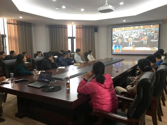 在家班子成员以及无课的师生代表在实验楼南201会议室集中收看会议开幕式直播,共同关注和探讨“两会精神”。