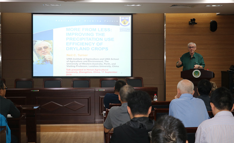 Neil C. Turner院士首先介绍了澳大利亚的土壤环境、气候条件等农业生产的实际情况。随后,他从早播、种子处理、氮肥水平、水分利用、渗透调节、蒸腾效率以及基因层次等方面分析了提高作物产量的方法并展示了团队在提升作物水分利用效率方面的最新研究成果。