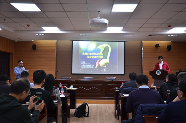 林荣呈研究员以“光照对植物早期生长发育的调控机制”为题,介绍了光照对种子萌发的可逆性、对子叶转绿以及对植物幼苗形态建成三个方面的调控作用,搭建了植物早期生长发育的调控网络,并揭示了其响应光照的分子机制。