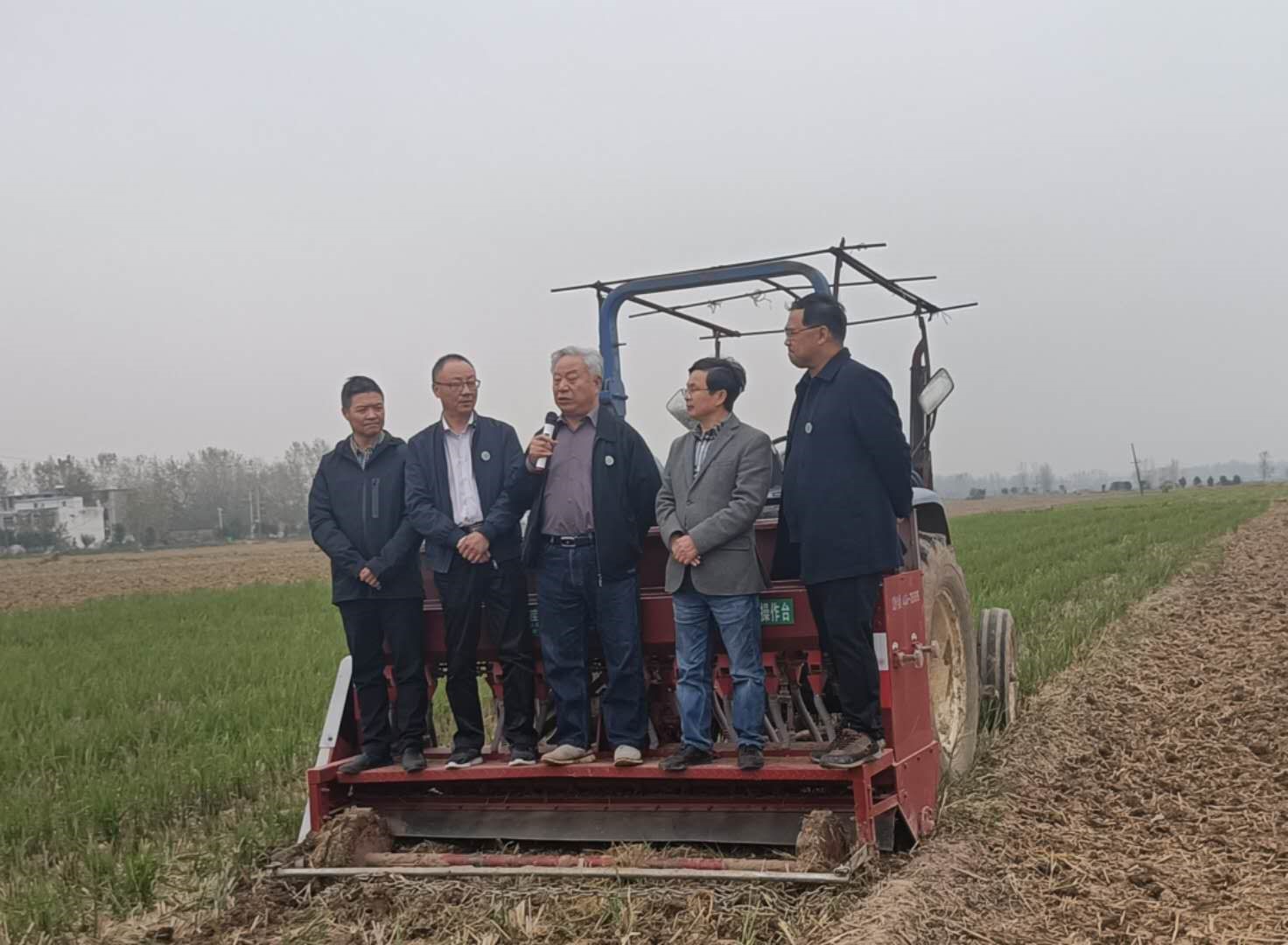 服务团一行查看示范基地新装备播种情况