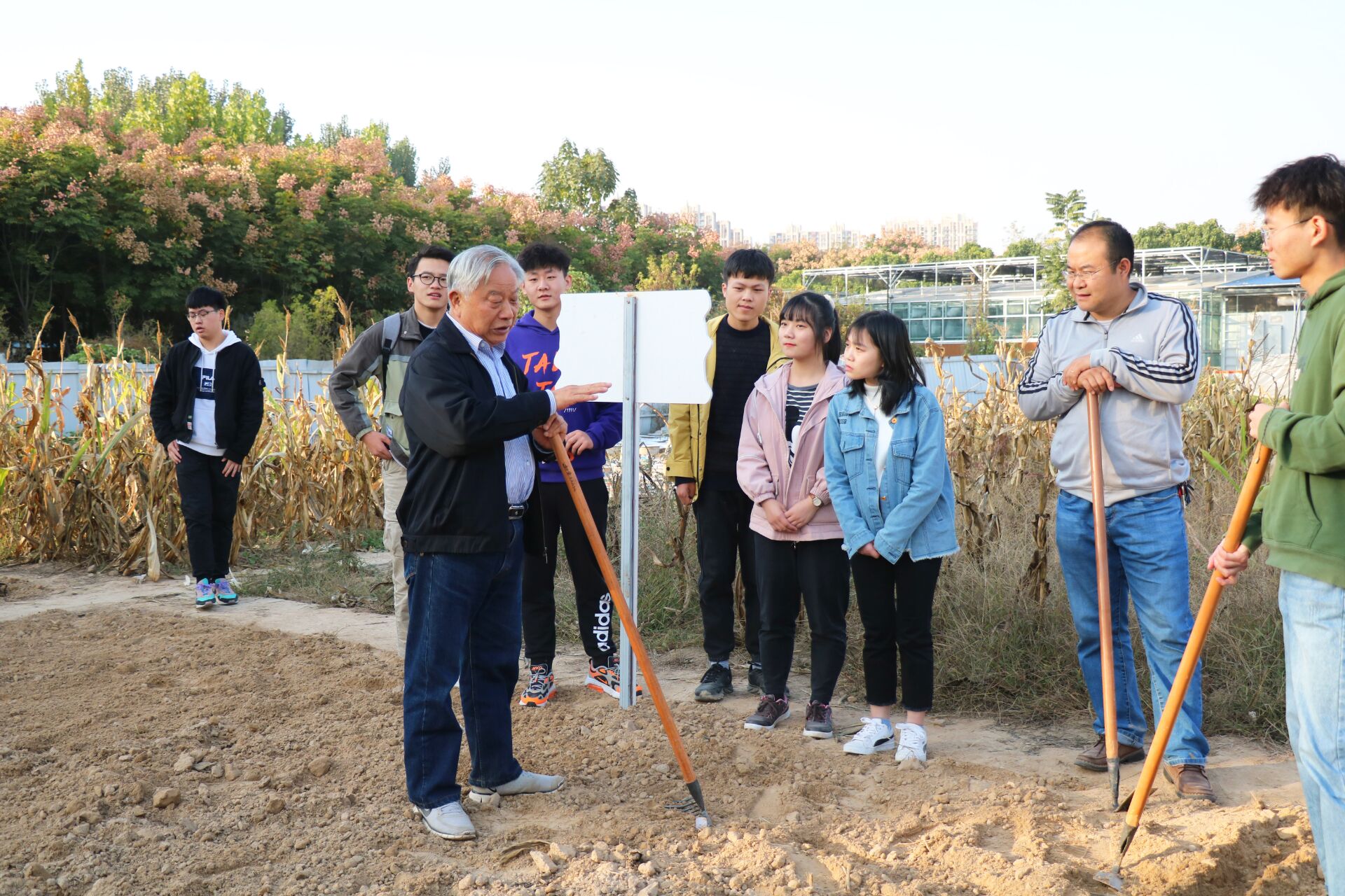 郭天财教授向同学们展示播种方法