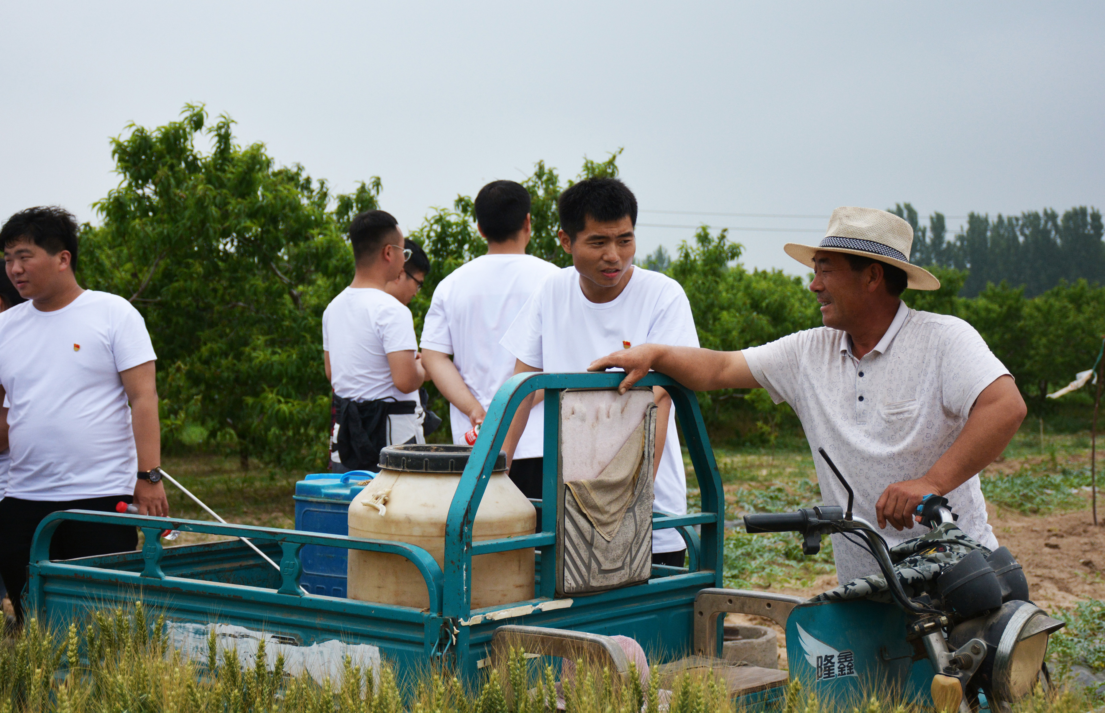 硕士生许豪向农户介绍农药配比和喷施方法