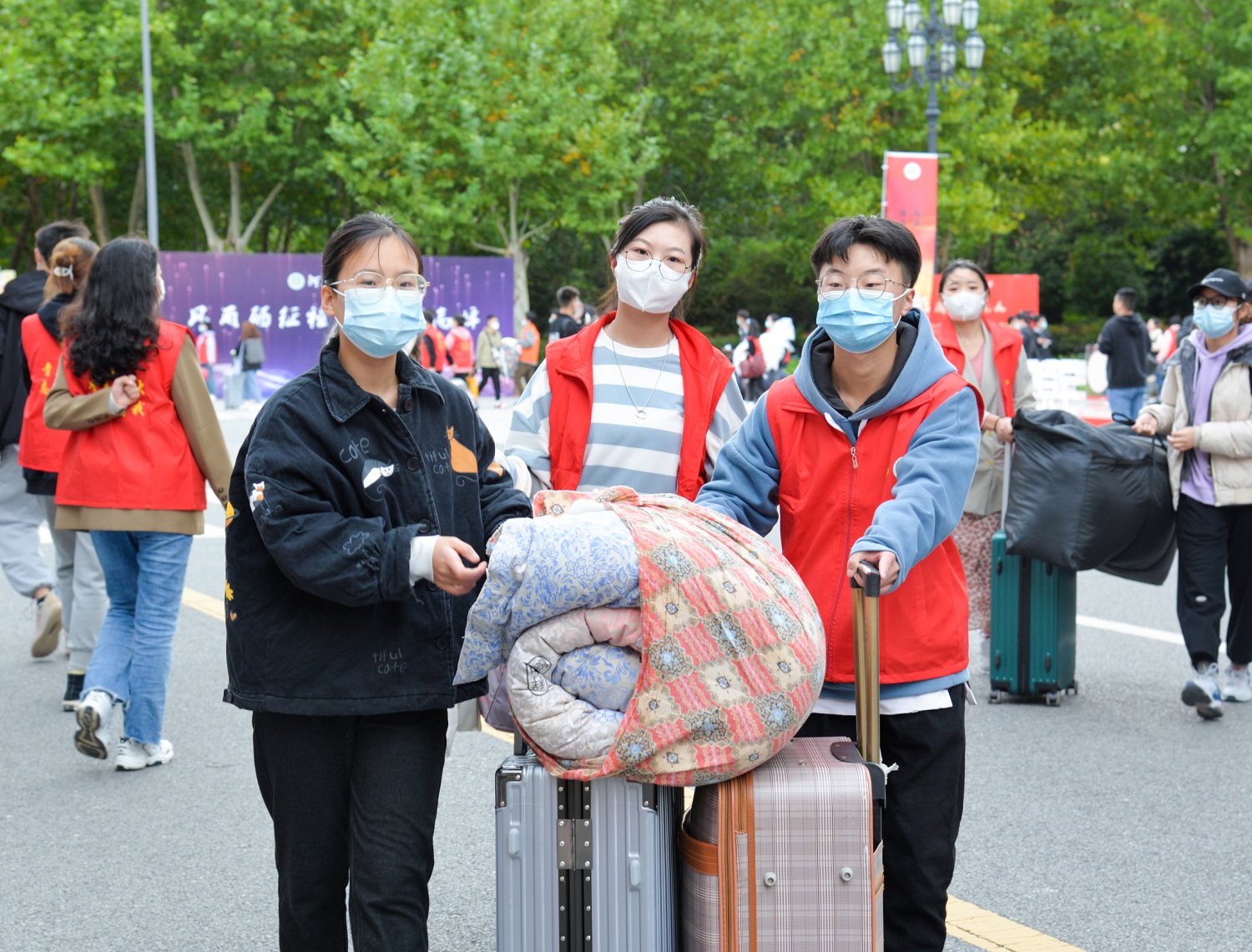 的“爱心车队”一路护送他们到达宿舍。校园中忙碌的红色身影,是今日一道美丽的风景线。