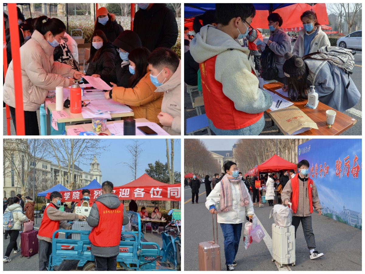 组织的志愿服务队,为返校学子搬运行李,使同学们感受到“回家”的温暖。学生完成报道、在宿舍稍作整顿后,及时前往繁塔楼AB座教学楼中间大厅进行全员核酸检测,确保返校后的安全。