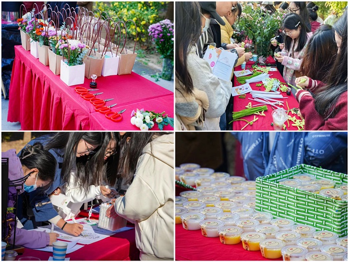 师生将自制的菊花茶、香包、果冻等菊花产品带到现场,供现场师生们了解使用;以菊花为主题的摄影作品、书画及相关作品等获得大家的一致好评;同时,现场围绕菊花设置“菊色秋日”、“诗拾菊花”、“菊海诗意”等活动,在活动中为菊花填色或编制绒花即可获得印章,收集一定数量的印章可抽取精美奖品,各个活动场地都有许多学生围在一起,或踮着脚尖,或伸着脑袋,相互谈论着“谜底谁猜出来了”,“菊花茶好清香啊”,“香囊里装的什么呀”……此次菊花文化节活动始于传承,继于创造,丰富多彩的活动内容,将传统文化与现代艺术相互融合,弘扬了中华优秀的传统菊花文化。