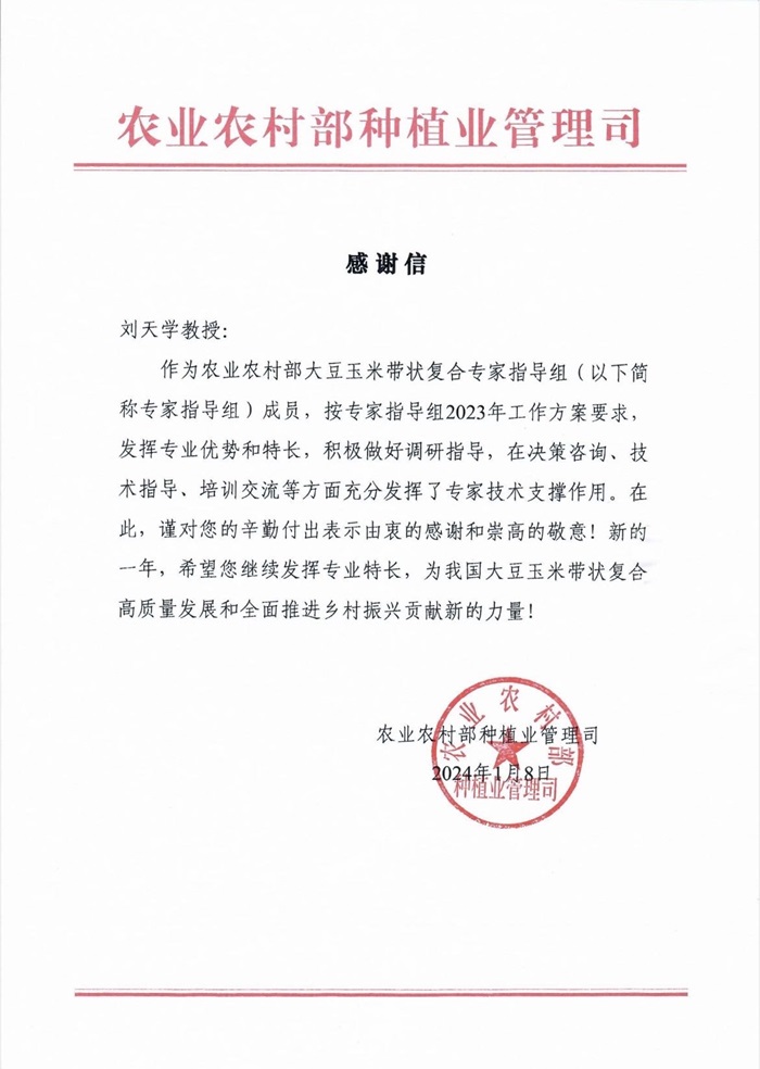 信中高度肯定了刘天学教授作为农业农村部大豆玉米带状复合专家指导组成员,按专家指导组2023年工作方案要求,发挥专业优势和特长,积极做好调研指导,在决策咨询、技术指导、 培训交流等方面充分发挥了专家技术支撑作用。并对刘天学教授的辛勤付出表示由衷的感谢和崇高的敬意。