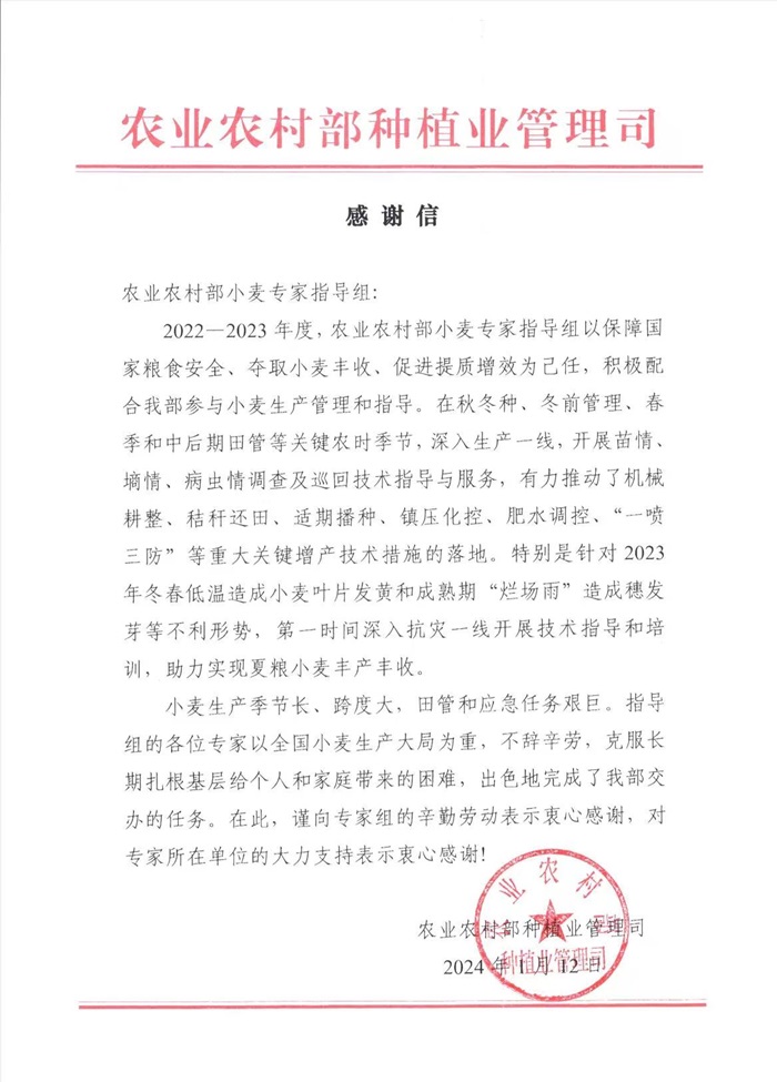 信中高度赞扬了郭天财、王晨阳、谢迎新三位专家,感谢他们针对小麦成熟期“烂场雨”造成穗发芽等不利形势,第一时间深入生产一线实地调查评估,完善防灾减灾救灾技术方案,有针对性的开展技术指导,最大限度地降低因灾损失;感谢他们针对近期持续低温雨雪冰冻天气,顶风雪、冒严寒深入麦田开展调研和指导工作,得到中央领导的肯定,为助力小麦丰产丰收发挥的重要作用。刘天学教授作为农业农村部大豆玉米带状复合专家指导组成员,充分发挥专业优势,积极做好调研指导、决策咨询、技术指导、培训交流等方面的专家技术支撑作用。信中对刘天学教授的辛勤付出表示由衷的感谢和崇高的敬意!并期待刘天学教授继续发挥专业特长,为我国大豆玉米带状复合高质量发展和全面推进乡村振兴贡献新的力量。