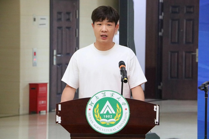 2024届毕业生求职学生代表袁东阳发言,他就强农兴农要有责任、干事创业要有底气、脚踏实地要有担当三个方面展开发言,他讲到,把青春扎根在农业这片热土,在农业工作中增长才干,是农大人共同的责任,更是农学学子的无悔选择。他对极速快三