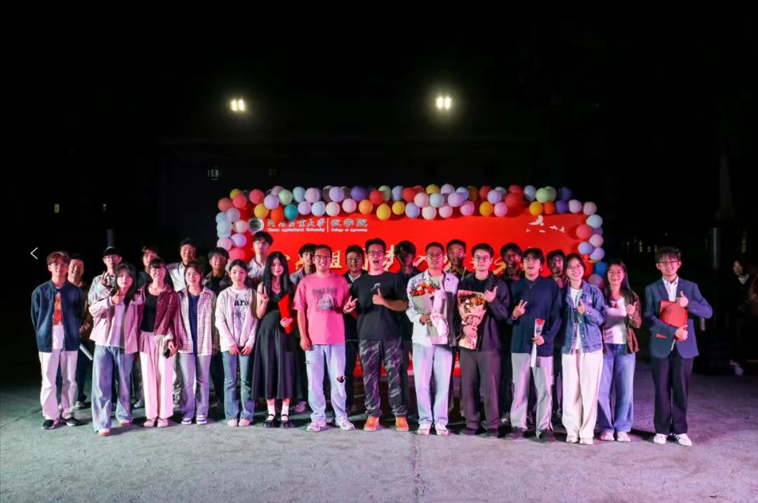 时光流转,秋风相邀。活动在朗诵《盛世中国》中拉开帷幕,农院学子用深情的朗诵表达对共和国生日的祝福。农院百名师生在草坪上席地而坐,操场上的璀璨灯光,是学生内心翻滚的滚烫欢呼;晚风里的流光溢彩,是学生身体里涌动的青春热血。晚会期间,杨航老师用弹唱《等你下课》送给新生祝福和期望,唐朝老师表演了一段动感十足的街舞,热烈而张扬,给学生们带来了一场视觉盛宴,将气氛拉上了高潮。艺术团和au街舞社展示了舞蹈《MEOW》,以舞步为画笔,舞动人生、唱响青春。生科24-2班的杜莹莹同学带来舞蹈《鸳鸯戏》,她用优美的舞姿展现了爱情的美好与浪漫。主持人用简单有趣的小游戏《你来画我来猜》拉近学生们之间的距离,现场气氛十分活跃,学生沉浸在晚会轻松欢快的氛围之中。生科1班全体学生带来大合唱《起风了》唱响了青春的韵味,热情奔赴下一场山海。最后,师生合唱歌曲《晴天》,在音乐的旋律里,让青春记忆的篝火,熊熊燃起。迎新音乐会在大家合影中圆满落幕。