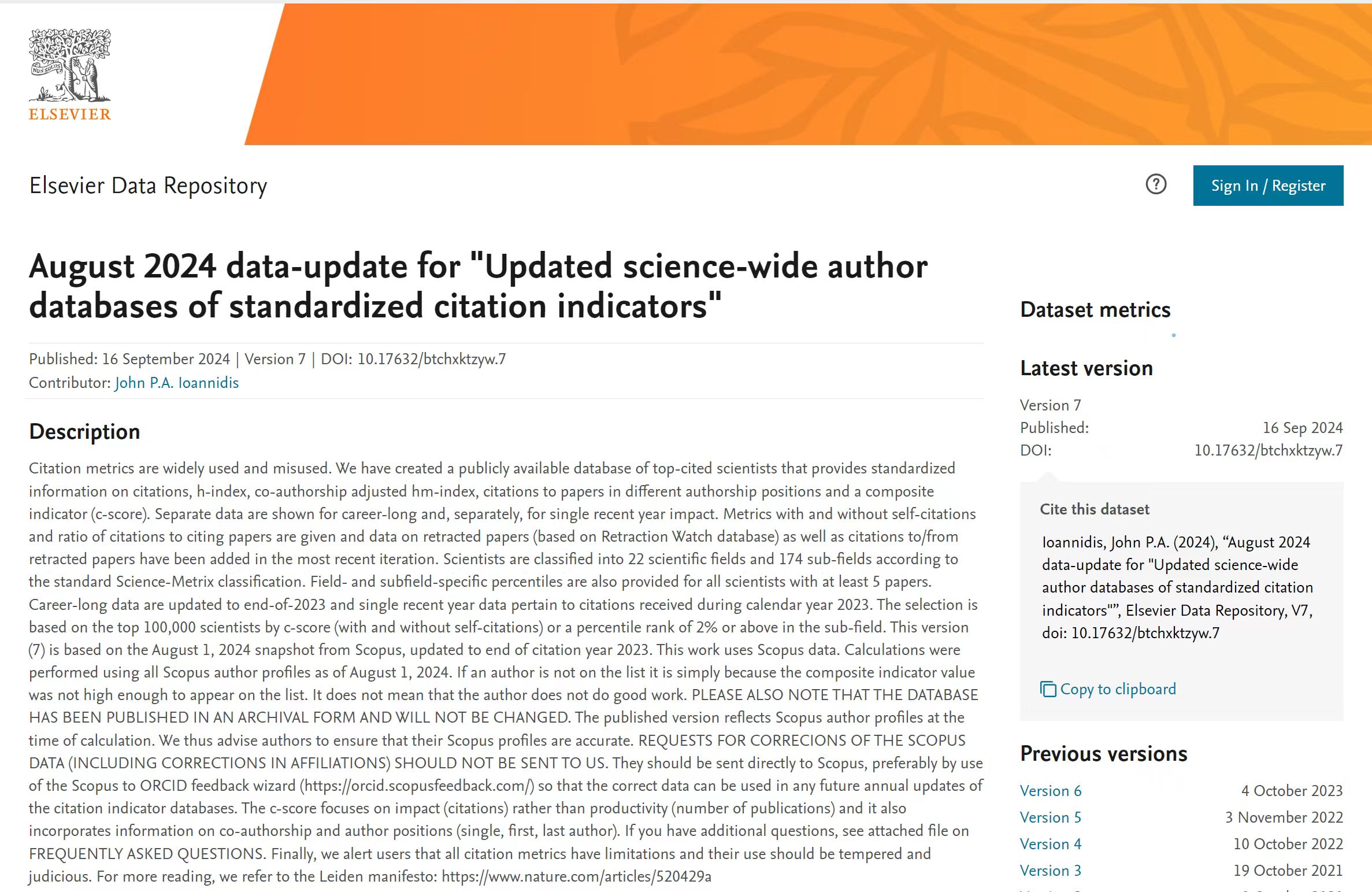 全球前2%顶尖科学家榜单由斯坦福大学John P.A. Ioannidis教授团队与国际权威学术出版社Elsevier合作的项目成果,发布在Elsevier旗下的Mendeley Data网站上。榜单基于Scopus数据库的引用数据系统分析,对全球约700万科学家的论文引用数(区分自引和他引,提供自引数据)、H指数、合著者调整的HM因子、单独或第一作者的文章引用数等参数进行综合考量,涵盖文、理、工学科,收录来自22个学科领域、176个子学科领域全球排名前2%的科学家,能够更客观、更真实地反映科学家的产出量和学术影响力,为科学家长期科研表现提供了一个衡量指标。入选“2024年度全球前2%顶尖科学家榜单”表示该学者在其研究领域中处于顶尖水平,具有世界级影响力,是世界公认的较为客观、真实反映科学家的产出和学术影响的指标。