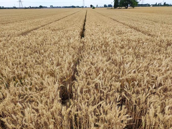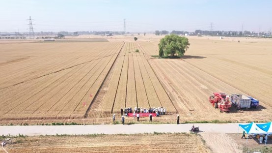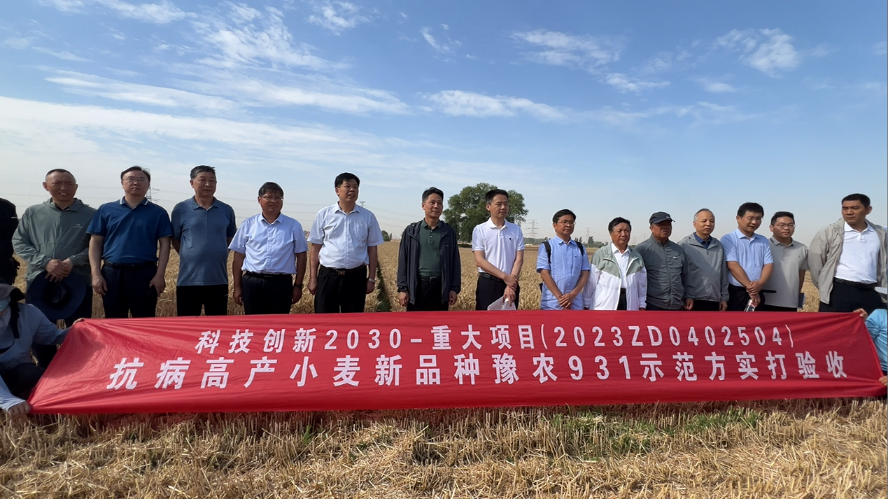 殷贵鸿团队在河南省新乡市新乡县朗公庙镇二仙庄隆平高科安徽华皖种业有限公司新大种业种子繁育基地建立的高产、兼抗赤霉病条锈病和黄花叶病小麦新品种“豫农931”百亩种子繁育田进行综合性状考察。