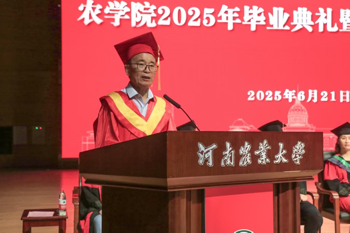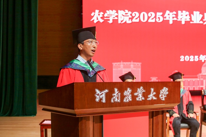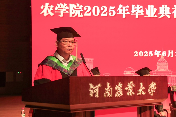 学术副校长、院长王道文在讲话中深情回顾了农大人扎根土地、服务农业的奋斗历程,并向毕业生提出三点殷切期望:一是心系沃土,筑牢“弘农报国”的信仰之基。心系沃土,牢记粮食安全“国之大者”,赓续农学人初心,将保障国家粮食安全与乡村振兴奉为毕生使命,以“强农有我”的担当融入时代伟业,书写无愧华章;二是砥砺深耕,勇担“厚生丰民”的时代之责。希望毕业生像一粒粒饱含希望的种子,向下扎根、向上生长,保持韧性勇气。无论身处基层、科研、产业或其他岗位,都需摒弃浮躁、拒绝“躺平”,脚踏实地,勇担攻克农业核心技术、推动绿色发展、服务乡村全面振兴的时代先锋,让智慧惠泽民生;三是永葆锐气,践行“实干兴业”的奋斗之志。毕业是人生新航程的扬帆,面对农业转型与智慧农业、生物育种等新机遇,建议同学们先立足专业投入工作、积累经验,先就业再择业,夯实基础、吸收养分、茁壮成长,在开拓创新中持续追逐人生梦想。他动情表示:“莫愁前路无知己,四海皆闻农学人!母校永远是你们坚强的后盾和温暖的家园。”