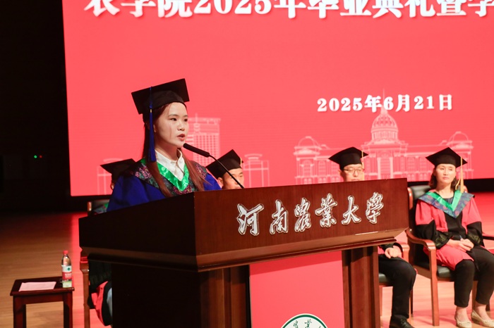 研究生代表孟娟代表全体研究生毕业生向母校与恩师致以最诚挚的谢意。她以袁老“做一粒好种子”的精神自勉,强调成熟意味着永葆向下扎根的定力与向上生长的初心。她表示将始终秉承校训院训,积极投身乡村振兴伟大事业,为农业强国建设贡献力量,并衷心祝福母校再创辉煌、恩师桃李满天下。