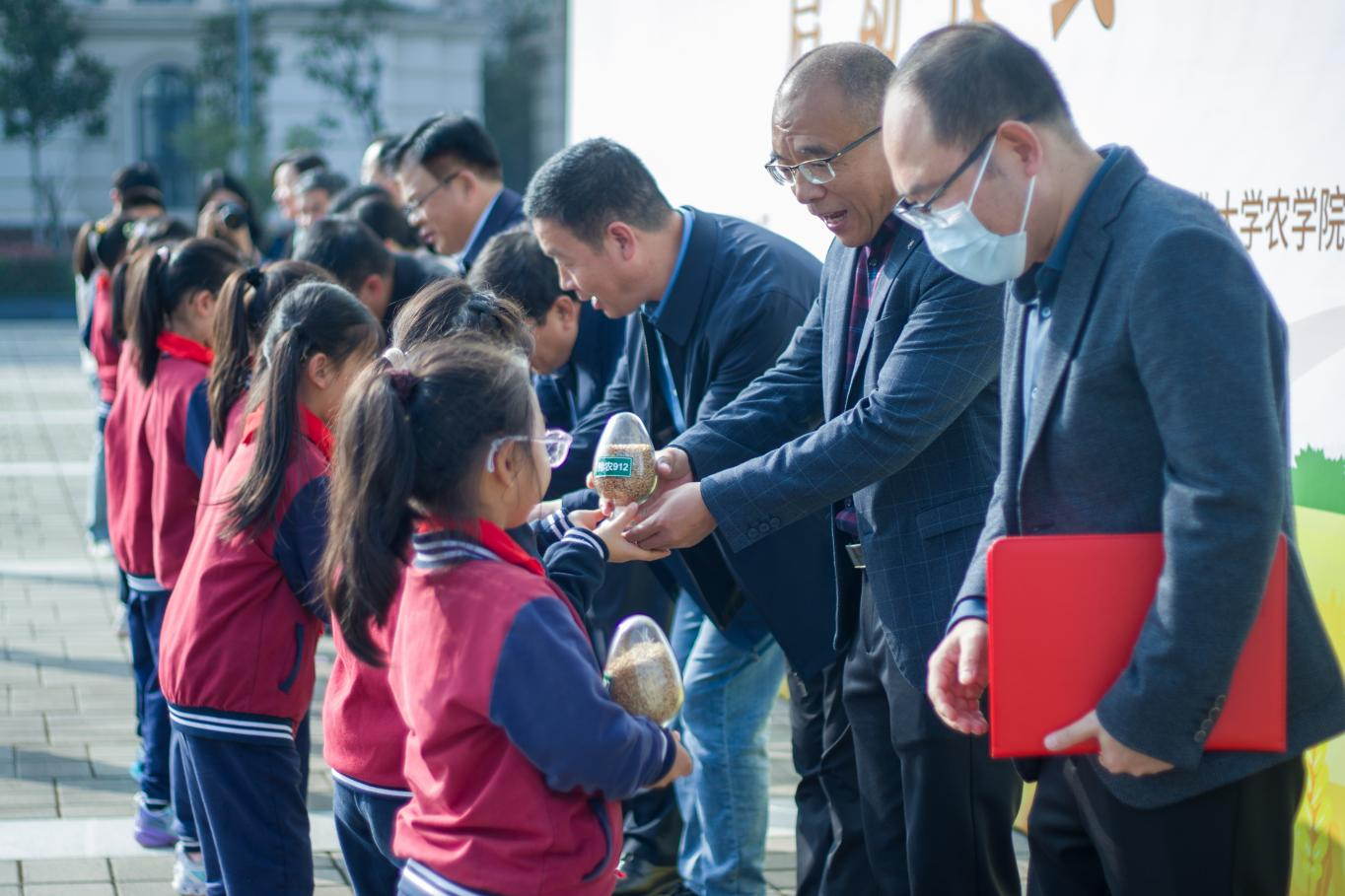 与会领导向附属中学小学部的学生代表赠送作物种子