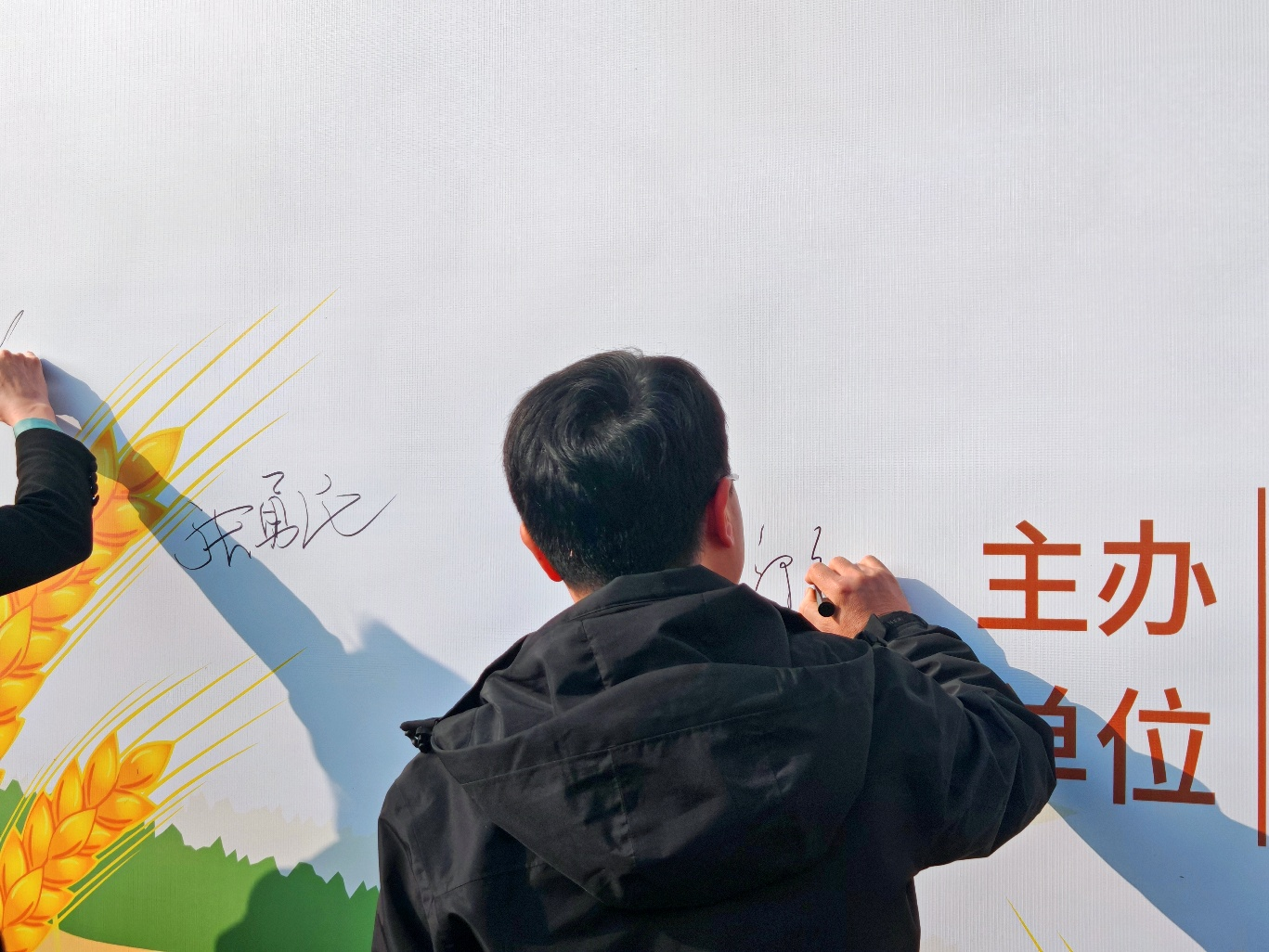 与会领导与师生代表依次在主题桁架上签字