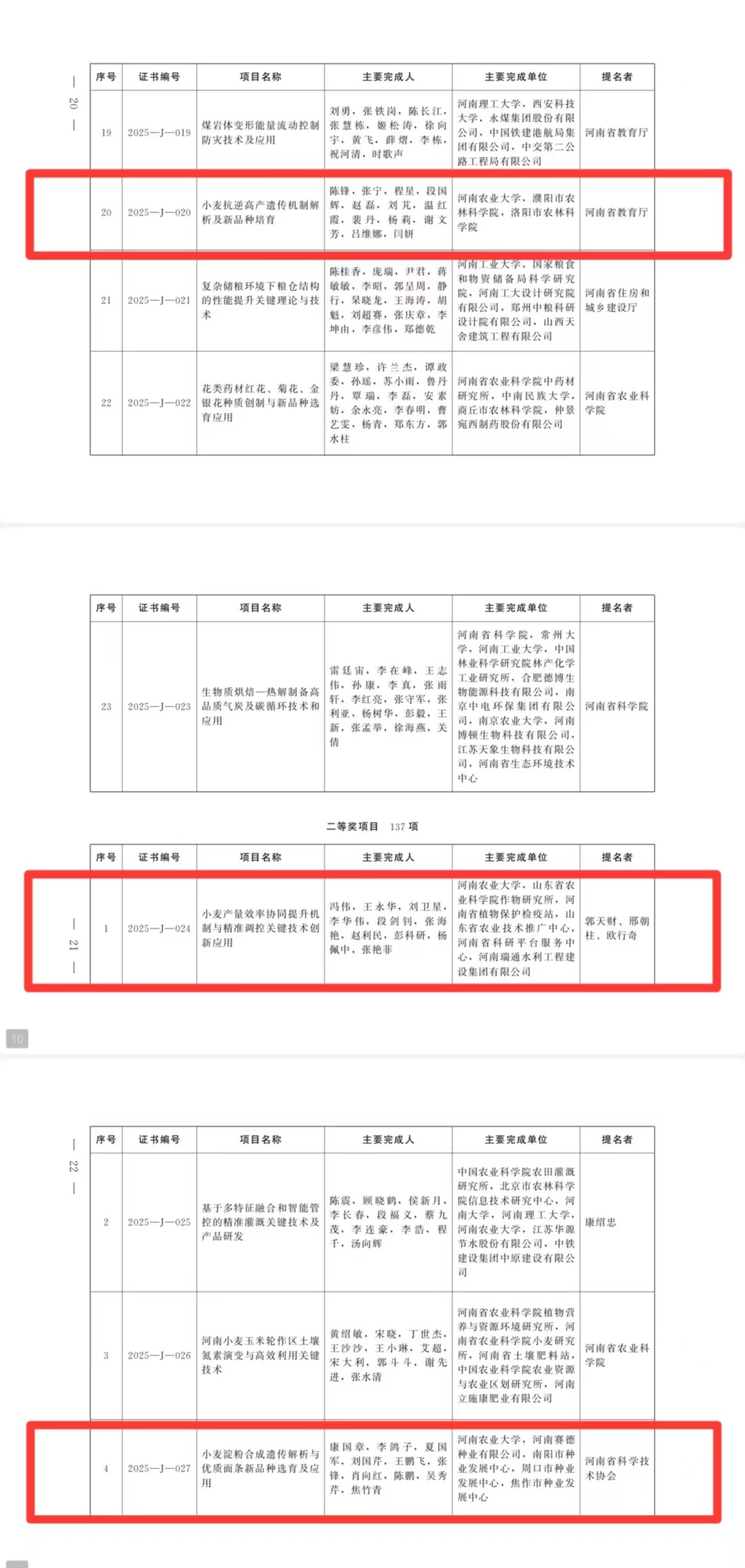 陈锋教授团队的《小麦抗逆高产遗传机制解析及新品种培育》深耕小麦抗逆高产与新品种,斩获河南省科学技术进步奖一等奖;冯伟研究员团队的《小麦产量效率协同提升机制与精准调控关键技术创新应用》聚焦小麦生长监测与技术创新,荣获河南省科学技术进步奖二等奖;康国章研究员团队的《小麦淀粉合成遗传解析与优质面条新品种选育及应用》解析分子机制创制优异品种,荣获河南省科学技术进步奖二等奖。
