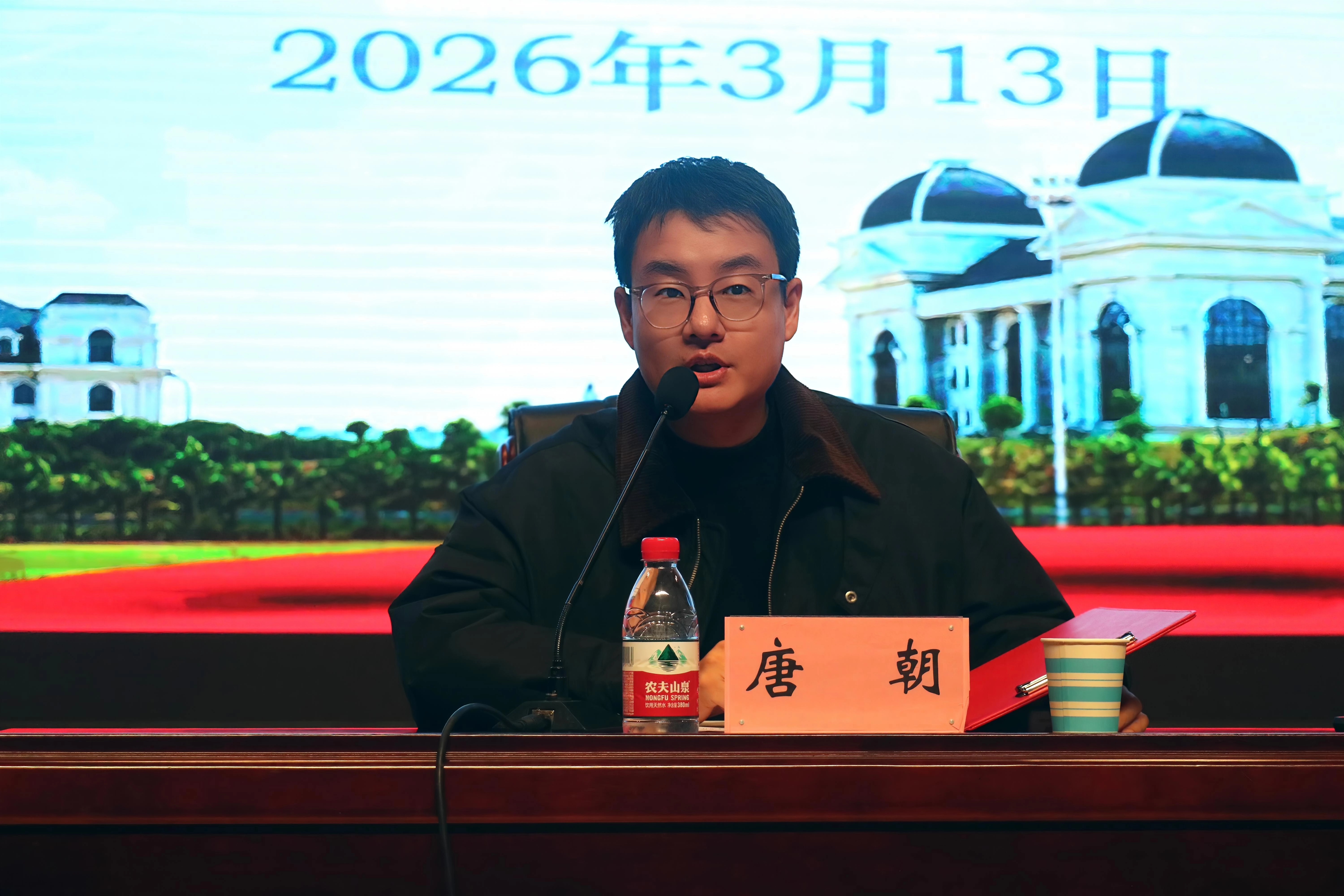 2025级全体学生参加,会议由院团委书记唐朝主持。