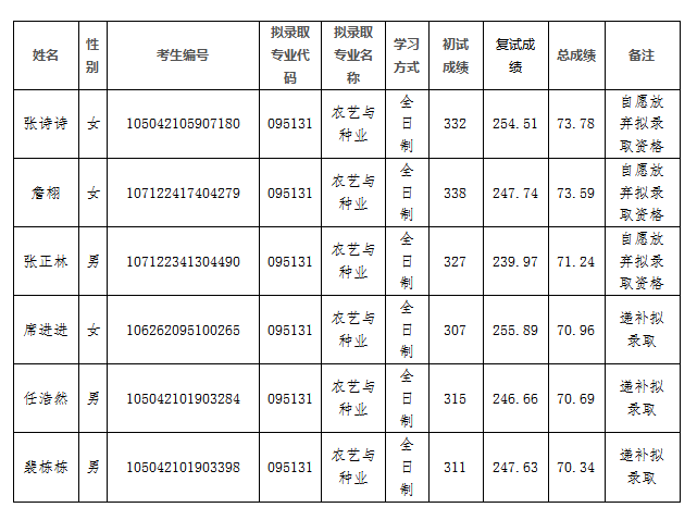 农艺与种业专业(作物方向)已公示的拟录取名单中,考生张诗诗(准考证号:105042105907180)、詹栩(准考证号:107122417404279)、张正林(准考证号:107122341304490)主动放弃拟录取资格,现按照4月8日该专业总成绩排名,结合考生实际录取情况,递补拟录取考生席进进(准考证号:106262095100265)、任浩然(准考证号:105042101903284)、裴栋栋(准考证号:105042101903398),具体情况如下: