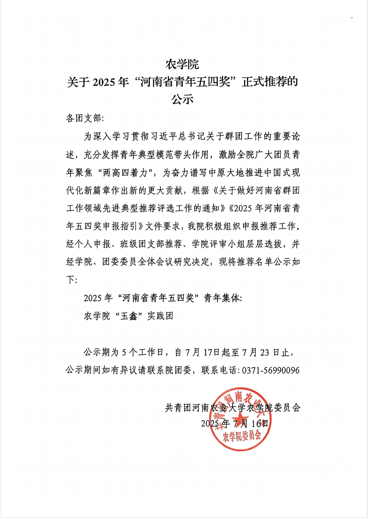 关于2025年 “河南省青年五四奖” 正式推荐的公示