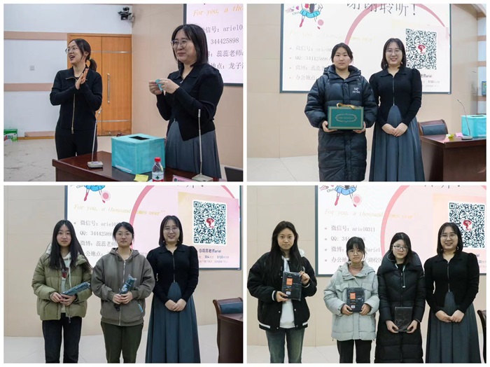 宣讲结束后,面对现场学生的积极提问,赵蕊一一耐心解答。随后,激动紧张的抽奖环节来临,氛围一下子“热”起来,现场一片片笑语欢颜,掌声不断。最后陈曦冉宣布一等奖一名、二等奖两名、三等奖三名,奖品颁发后大家合影留念,此次活动圆满落下帷幕。